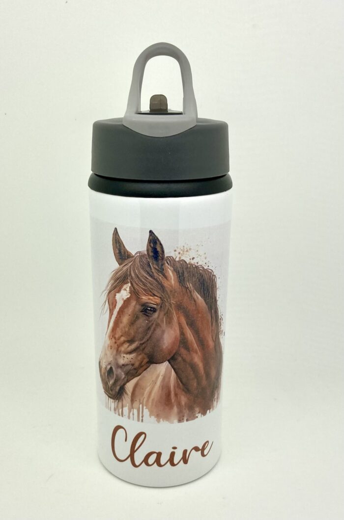 - 600ml White Flip Top Straw Bottle Personalised With A Beautiful Horse Design.